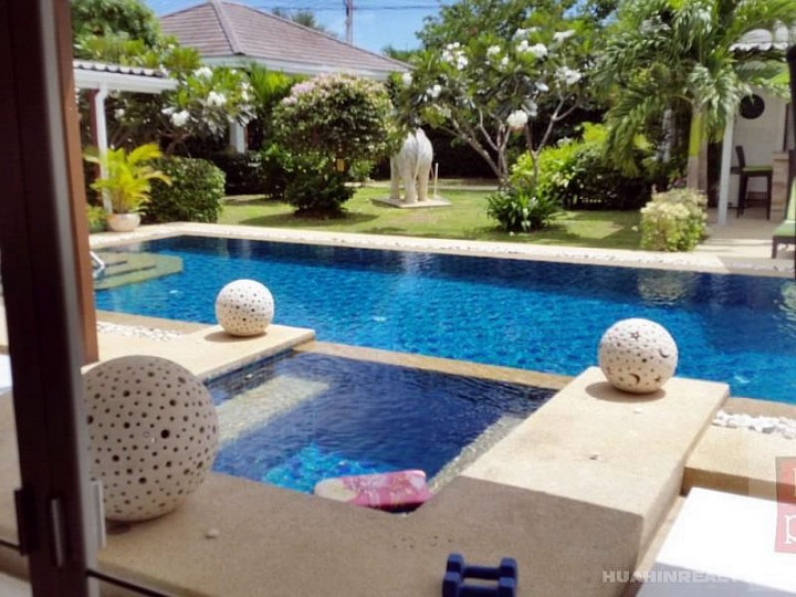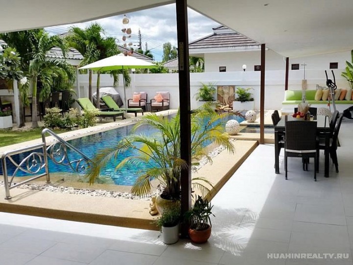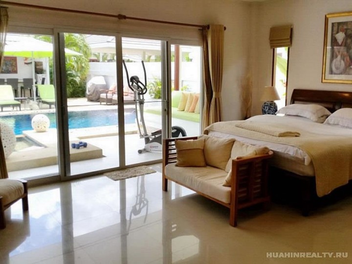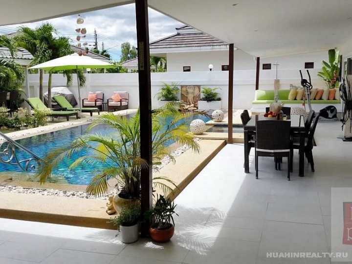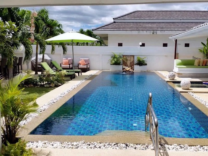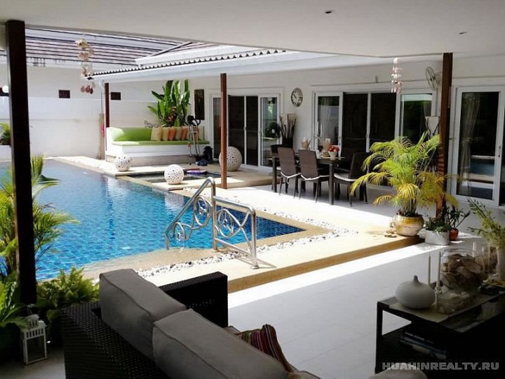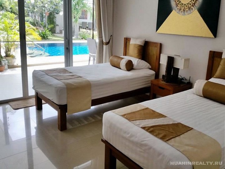 Вилла класса люкс в Хуа Хине с 4 спальнями и 5 ванными комнатами, большим бассейном и ухоженной приватной территорией в охраняемом поселке. Полностью меблированная вилла с большим набором дополнительных опций, включенных в стоимость данного дома. Идеальный дом для ценителей комфорта и проживания рядом с городом.