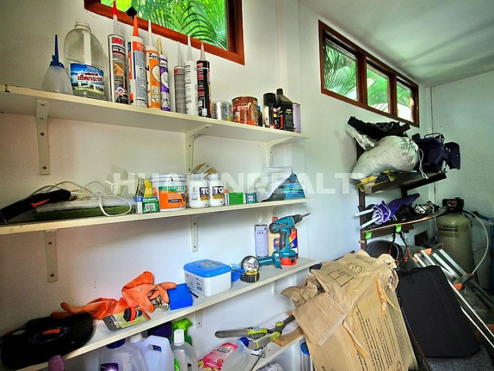 Большая просторная гостиная, совмещенная с полностью оборудованной по европейским стандартам кухней. Три раздельных спальных комнаты с собственными ванными комнатами, вход в которые осуществляется с террасы. Вход в четвертую спальню осуществляется из гостиной. В настоящее время комната переоборудована под домашний офис. Также на территории дома находится еще несколько отдельно стоящих помещений — гостевой туалет, фильтровая и насосная, большая кладовая комната у крытой автомобильной парковки. С обратной стороны дома расположена еще одна крытая терраса с оборудованной прачечной и емкостями для хранения воды.